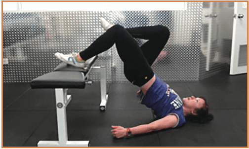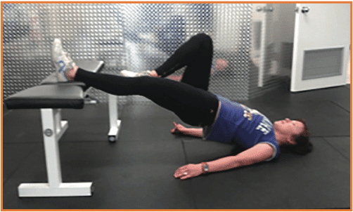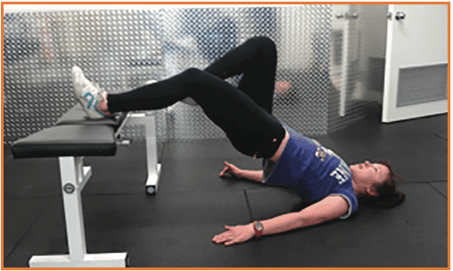 Start with the heel on a bench and the knee straight. Hold the other leg in flexion so that the foot is in contact with the inside of the knee. Lift the hip off the ground until the body is horizontal. Perform one set of 15 repetitions.